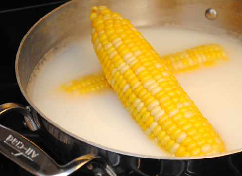 Bring to boil a little milk in water. Add to the boiling water a cob of maize. This makes the corn a little sweeter. All thanks to the milk!