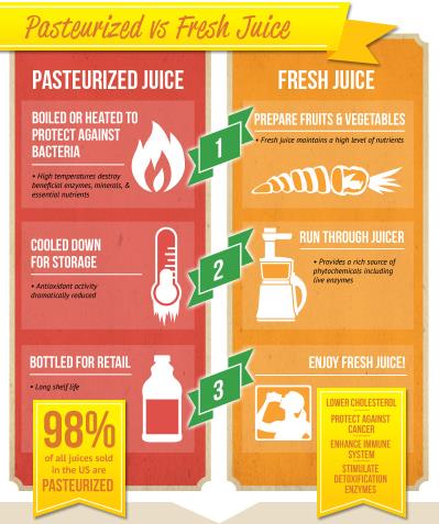The juice from the fruit is actually processed in the factories in order to increase its shelf life say ranging from 6 months to 2 years. Therefore, they are either heated or undergo a process called pasteurization, wherein the good and healthy benefits of the fruits get destroyed along with the bad bacteria.