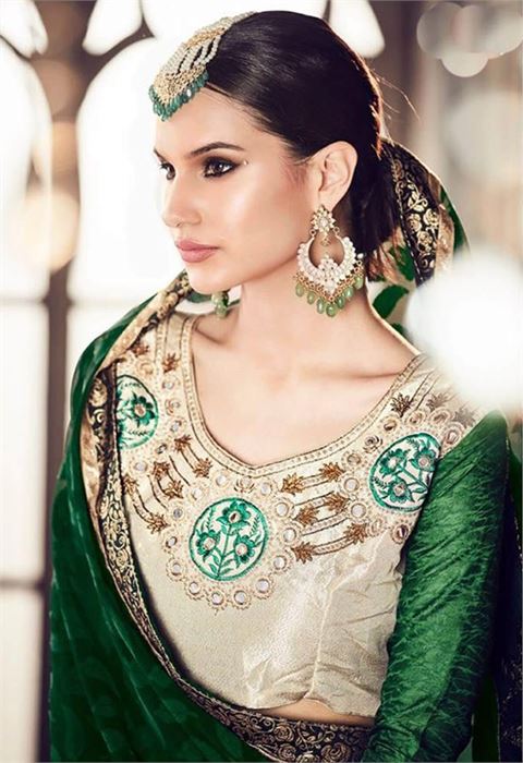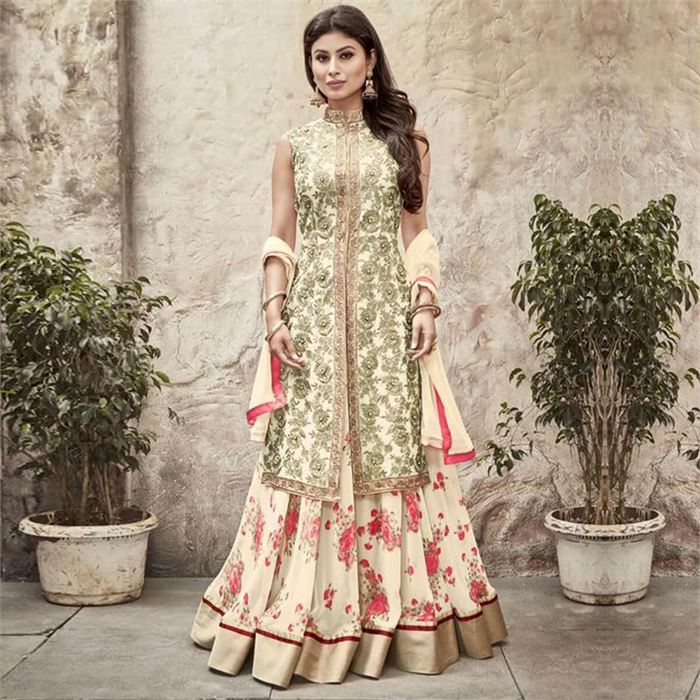 One of the most tasteful attires on the list, a saree can give your look a complete makeover. A headpiece and a kamarband would add on the already majestic look. For a more graceful look, you can go for a long-sleeved blouse. Different styles of sarees like, sequined, embroidered, zari or mirror work to name a few, open up a whole new closet of options. A bright-colored georgette saree with a marvelously etched out border is one of the currently popular trends.