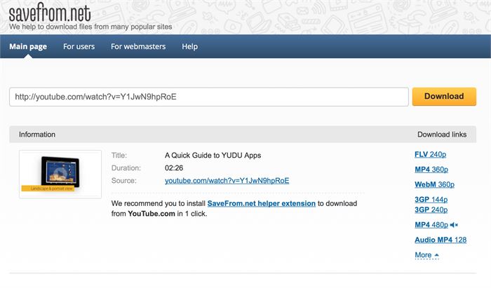 In case you wish to avoid the hassles and risks of installing third-party software on your computer, then you can download videos from YouTube to a computer using downloader or helper websites. These portals first convert the video of your choice to the format you pick and then offer you the download link, through which you can save the file on your hard disk. While using these websites, you can choose from FLV and MP4 to even AVI, whichever file format you want for your videos. Save good websites are savefrom and FLVto.