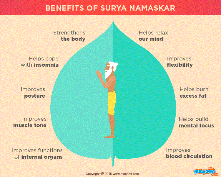When we wake up in the morning, it is said that the body will be stiff as we have slept the entire night. Therefore the first yoga pose would be to salute the sun god, and that is surya namaskar. This one yogic set of poses has enormous benefits like making the body and mind flexible by improving the blood circulation, postures and functioning of the internal organs, reduces the weight by burning the excess fat, etc, etc.