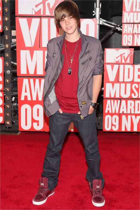 Justin hit up the 2009 MTV Video Music Awards in a lightweight gray zip-up track jacket and a crisp red tee. His hair was side-swept in his signature hairdo and he wore a cross and dog tag pendant around his neck. Classic Bieber!