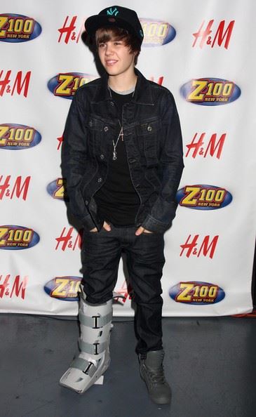Did you think a cast would throw off Justin Bieber's style? If so, you are sorely mistaken. The young pop star pulled off denim on denim with stark gray high-top sneakers and a flat rimmed NY Yankees cap for the 2009 Jingle Ball in Madison Square.