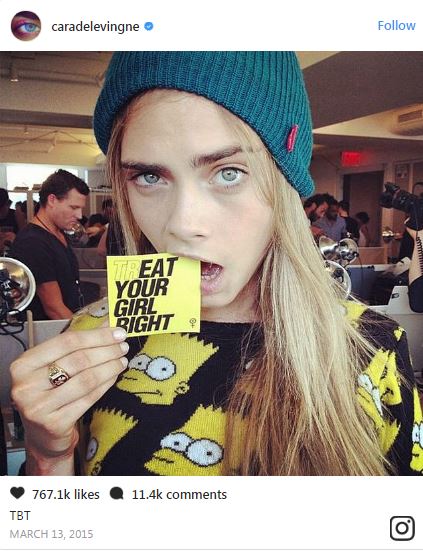 There is a lot here to love. From her makeup-free pose to that Bart Simpson sweater, to that double entendre message, Delevingne slew through and through. Oh, and her brows remained rad as ever.