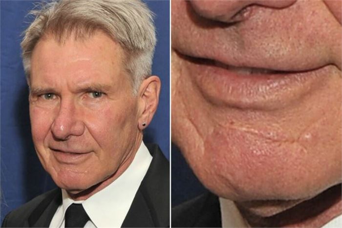 The famous scar on Ford’s chin, which the actor is seen explaining how he got it in different movies like Working Girl, Indiana Jones and the Last Crusade, was actually left after the Air Force One-star suffered a car accident when he was 20.