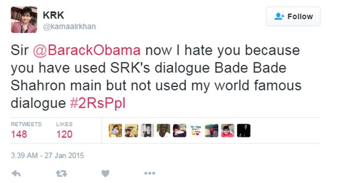 Well, you know how real KRK’s Twitter game is when you see that he has not spared even the US President. He went on to proclaim how mad he was at the President for using an SRK dialogue instead of a KRK dialogue in his speech.
