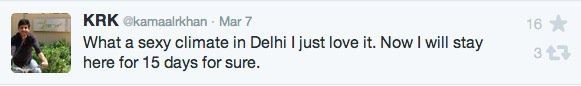 In this hilarious tweet, KRK grapples with the difference between weather and climate. Nonetheless, the annoying entertainer went on to declare a 15-day stay in Delhi with this funny tweet. It’s all for the love of sexy climate.