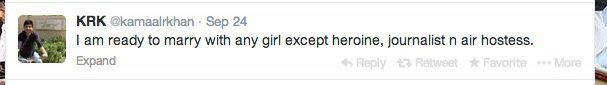 With this funny tweet, KRK again showed the world that he does have his priorities straight. While breaking the hearts of many, KRK announced that he would marry any girl except a Bollywood actress, an air hostess, or a journalist. This was quite a day for every other woman out there.