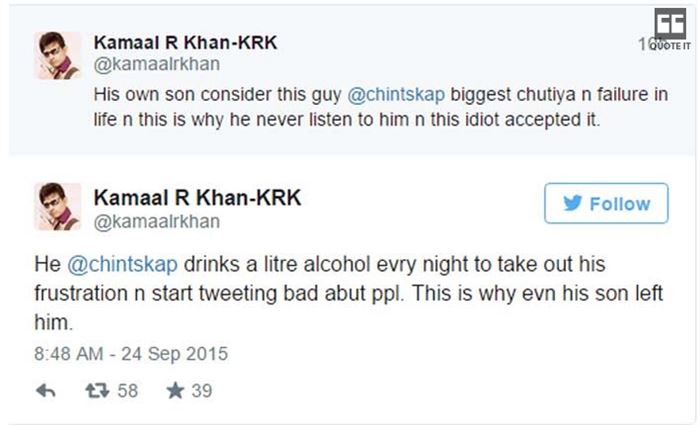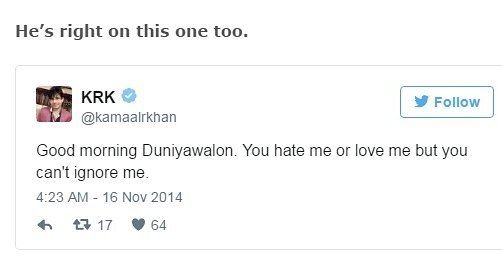 Kamal Rashid Khan, popularly known as KRK, has always managed to get the attention of the masses with his hilarious tweets. Not only does he comment on the most random of things, he has also declared war with numerous celebrities with his annoying and offensive tweets. In fact, there was a time when KRK was declared as India’s national pass time.