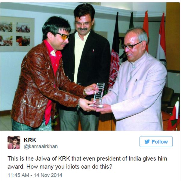 So, KRK posted a picture of himself getting an award from the Indian President. That’s just not enough. He even went on to write a bizarre caption, which only made it plausible that it was, in fact, an ‘idiot of the year’ award.