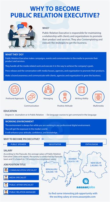 Public Relation Executive is responsible for maintaining a relationship with clients and organizations to promote their product and services. They also Contemplating and execute the strategies to get the business.